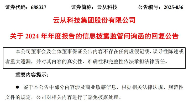 7月9日,科创板上市公司云从科技(688327)公告披露显示,公司于近日收到上海证券交易所科创板公司管理部下发的《关于云从科技集团股份有限公司2024年年度报告的信息披露监管问询函》(以下简称“问询函”)。问询函重点关注云从科技营收大幅下滑、主要客户显著变动、公司整体毛利率明显下降等情况。