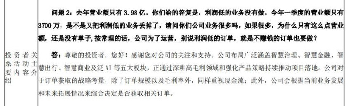 南都·湾财社记者注意到,除回复监管问询外,近期投资者也对云从科技业务波动情况高度关注。在其披露的7月4日投资者关系活动记录表显示,有投资者提问“今年一季度的营业额只有3700万,是不是又把利润低的业务丢掉了,请问你们公司业务很多吗?”云从科技回复称,“公司对于订单获取的战略考量,除了订单规模以及毛利率外,同样重视现金流。”