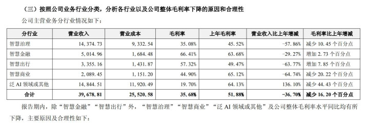 这种调整也反映在行业业务上。财报显示,云从科技传统营收最大板块的“智慧治理”板块(即G端业务)营收较上年锐减57.86%,智慧金融、智慧出行、智慧商业板块也有明显下滑。云从科技称,受政府项目公开招标“价格战”影响,报告期智慧治理业务收入锐减,毛利率降至35.08%(同比减少10.45个百分点)。主要原因在于竞标激烈导致价格走低,挤压利润空间。